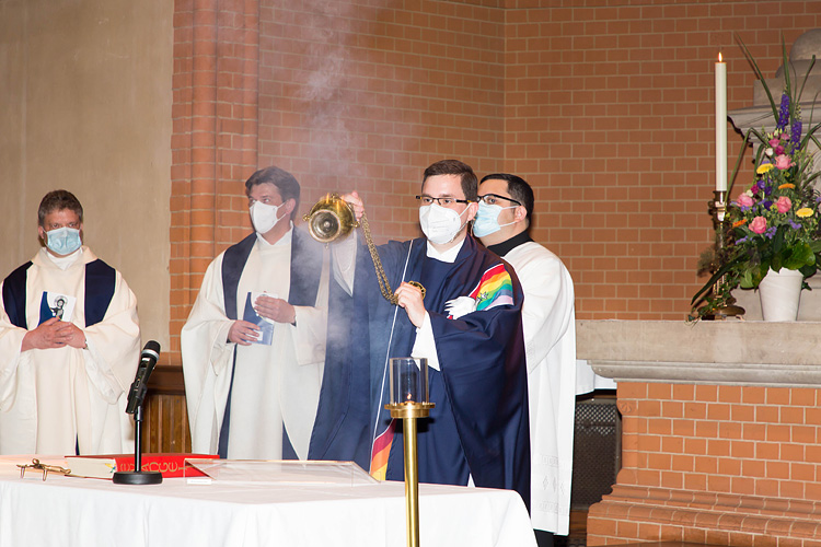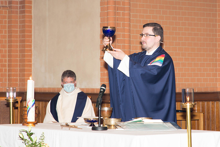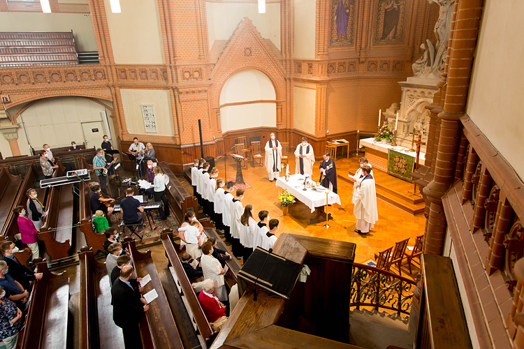 Viele Familienangehörige, Weggefährten und Freunde waren gekommen, ebenso natürlich zahlreiche Gemeindeglieder aus der weiten Pfarrei. Die evangelische Gemeinde hat uns wie schon so oft ihre wunderschöne Trinitatiskirche zur Verfügung gestellt, so dass es ein (natürlich mit allen Schutzmaßnahmen) großer und festlicher Primiz-Gottesdienst werden konnte.
