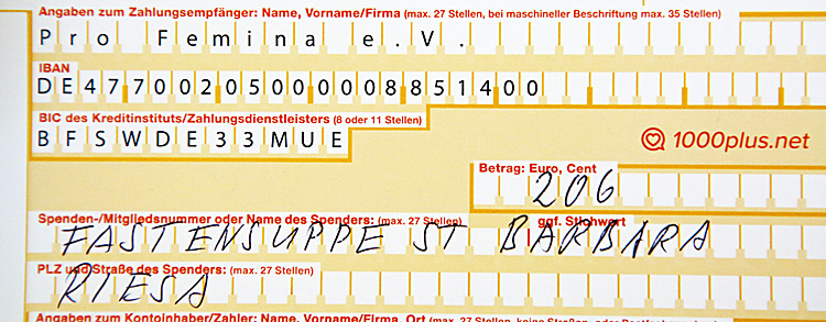Dieses Jahr konnte die traditionelle Fastensuppe der Kolpingfamilie wieder stattfinden. Der Erlös von 206 Euro wurde an Pro Femina e.V. überwiesen. „Pro Femina e.V. ist eine mildtätige und gemeinnützige Frauenhilfsorganisation. Aufgabe von Pro Femina ist es, Frauen im Schwangerschaftskonflikt kompetent zu beraten und ihnen jede erdenkliche Hilfe zur Verfügung zu stellen.“ Weitere Informationen sind hier und hier zu finden.